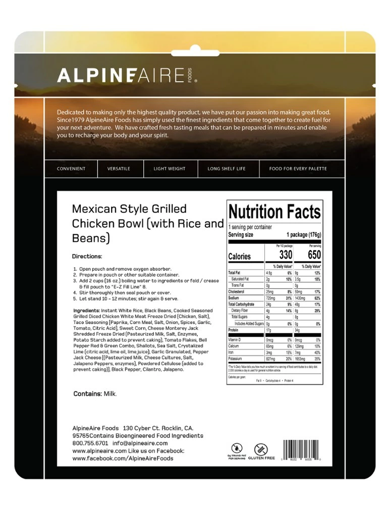 Enjoy seasoned chicken, corn, beans and rice with zesty lime and pepper jack cheese—the AlpineAire Foods Mexican-Style Grilled Chicken Bowl is great-tasting, easy-to-prepare fuel for your adventure.