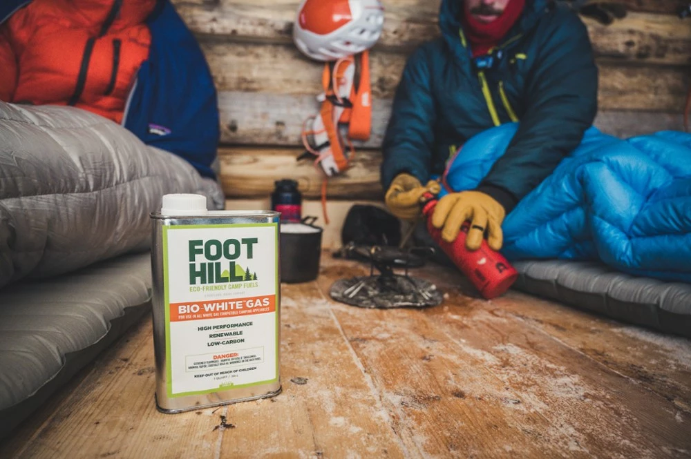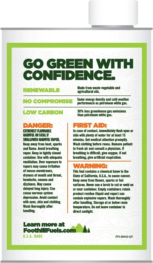 A renewable, low-carbon alternative to petro-based fuels, Foothill Fuels Bio-White gas is a drop-in replacement for liquid fuel compatible stoves using a proprietary formula made from vegetable oil.