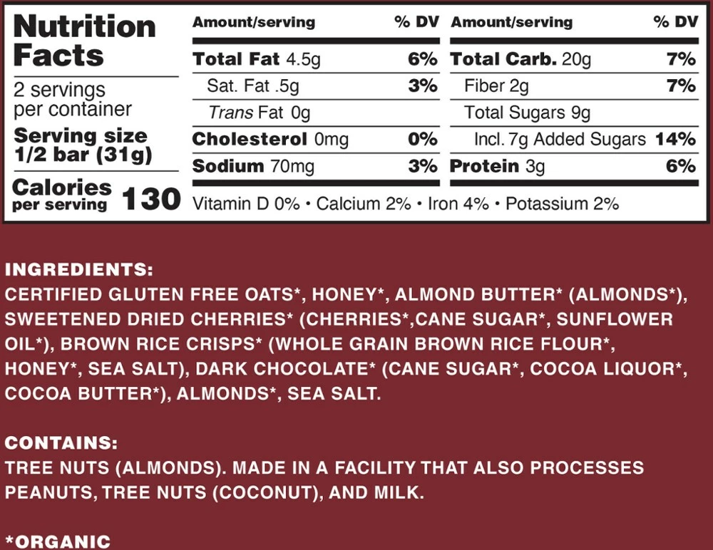 Tart cherries, smooth dark chocolate, and crunchy almonds make the Kate’s Real Food Dark Chocolate Cherry & Almond bar an instant favorite among bar connoisseurs.