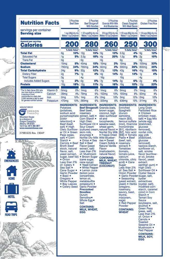 - Includes 12 total pouches: Beef Stroganoff (3), Classic Spaghetti (2), Beef Stew (3), Chicken Fried Rice (2) and Granola with Blueberries (2)